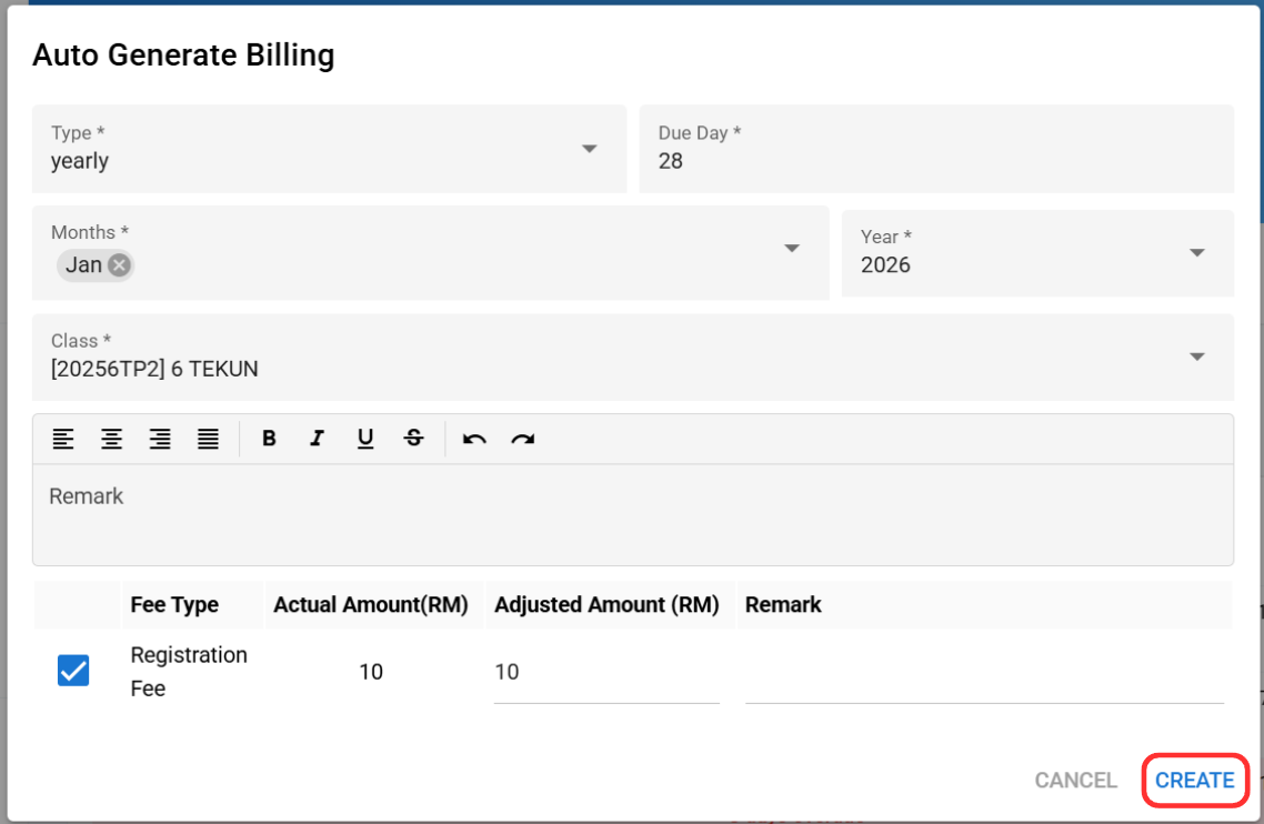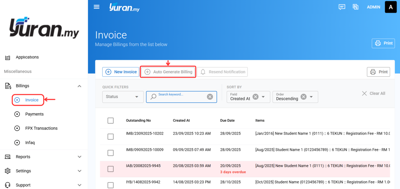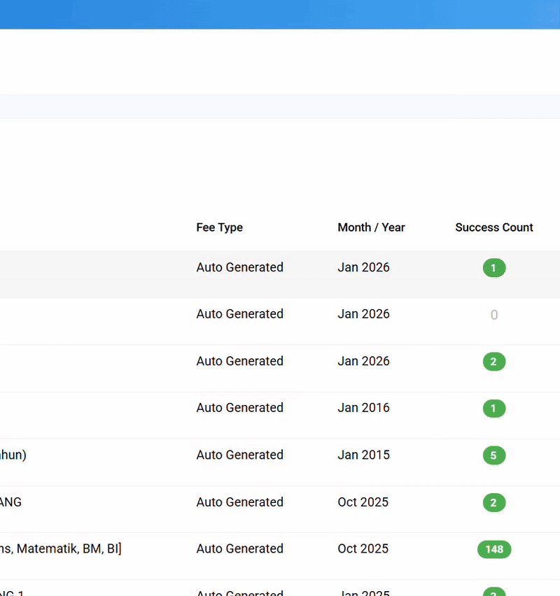 Auto Generate Billing is a feature in Invoice menu. Its purpose is to generate invoice in bulk typically for student in the entire class instead of generating the invoices one by one.