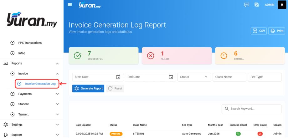 Step 1: Go to Report -> Invoice -> Invoice Generation Log