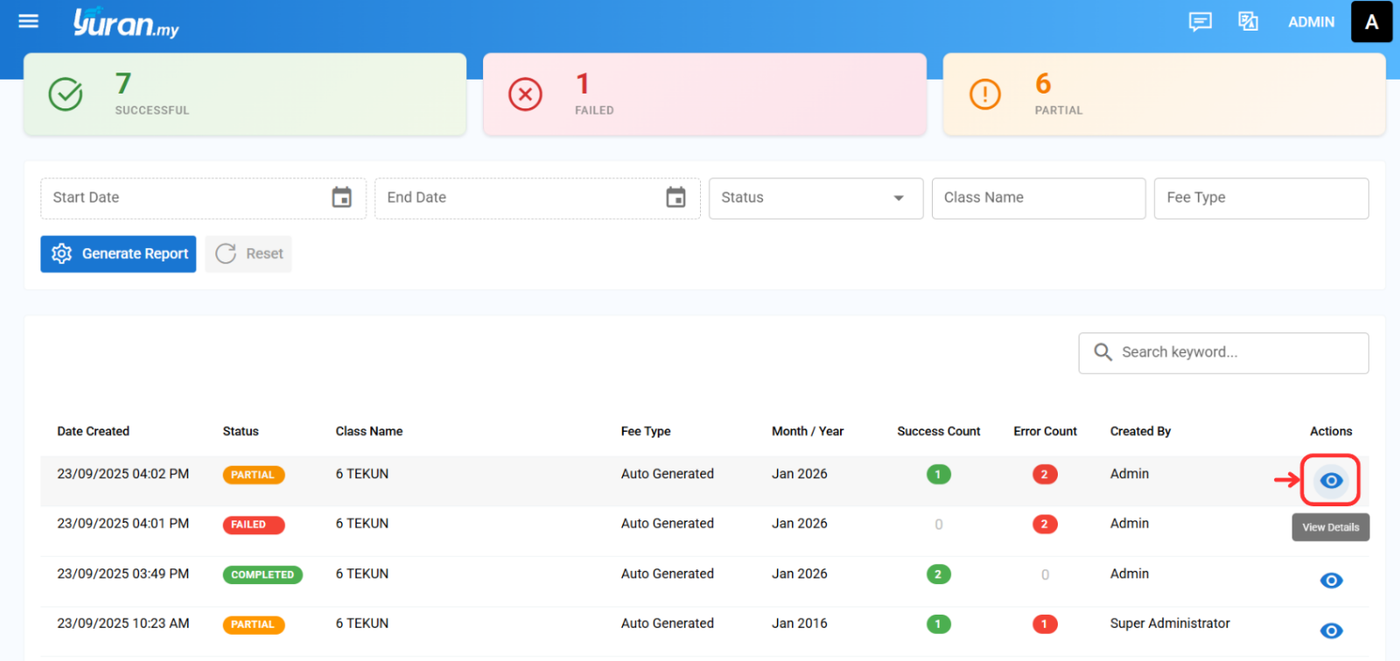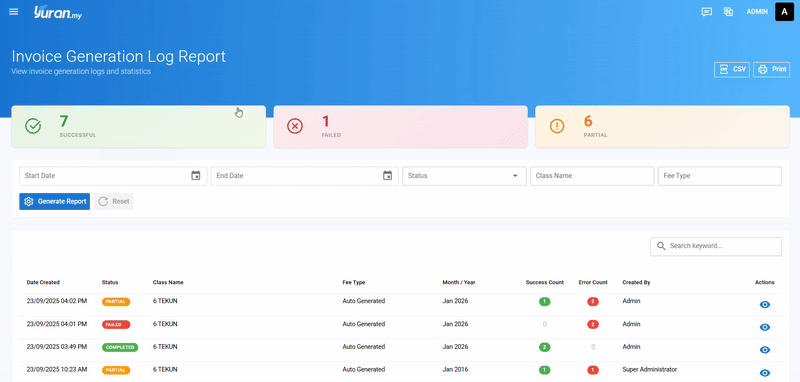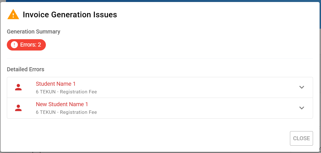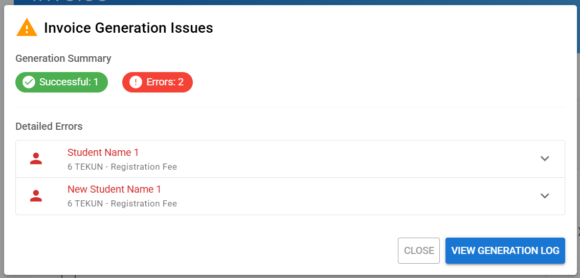 ⚠️There are various reasons why invoice(s) failed to generate. Some of the reasons are invoice already exist/generated or parent not assigned to the student.