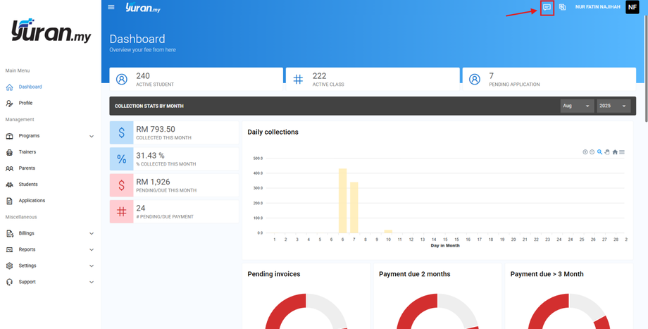 Step 1: Click the Announcement icon on the top of the Yuran.my System page.