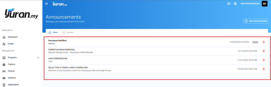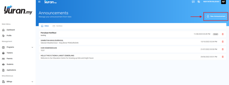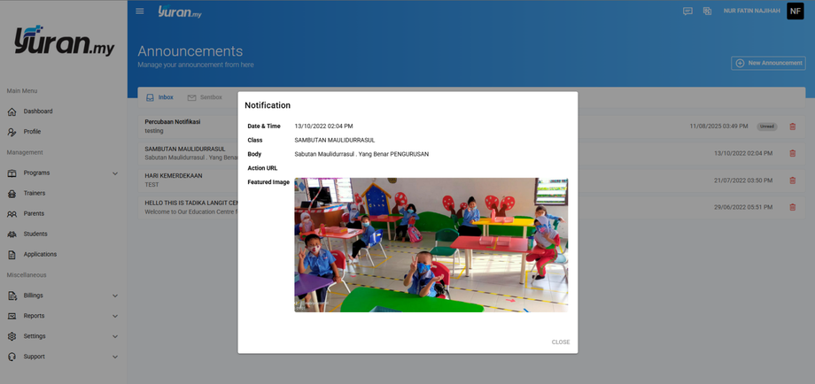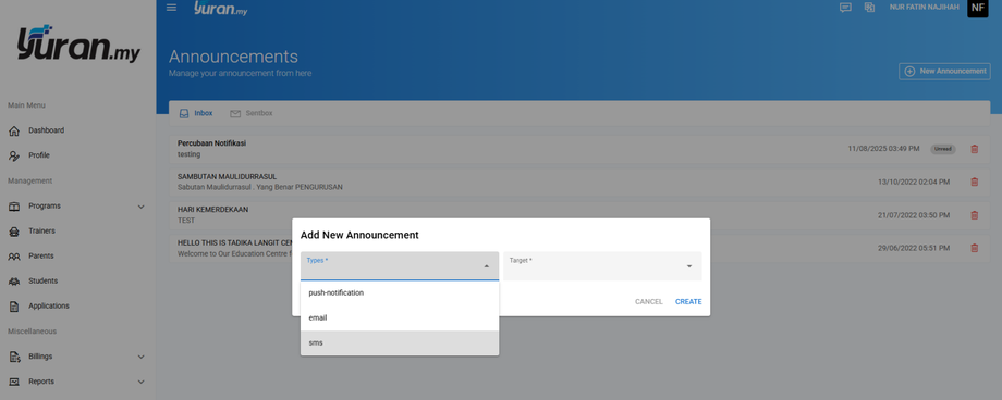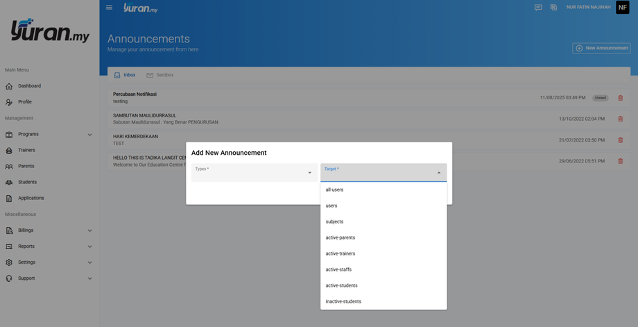 Announcement is one of the new features that has been upgraded on Yuran.my System version 3 where admin role able to send message or announcement individually or broadcasting.