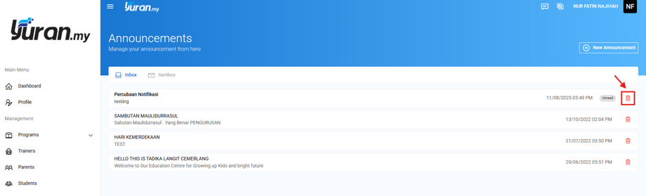 Step 1: Click on the Delete icon to delete the created announcement at the Sentbox page.