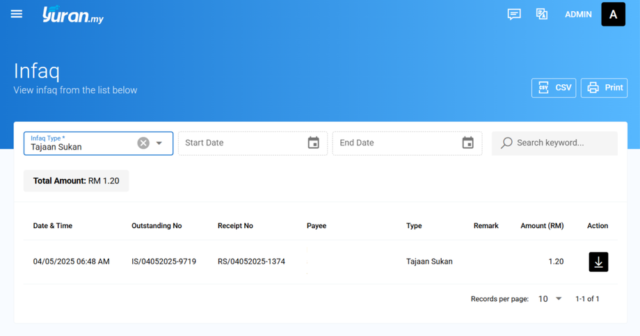 Step 2: You can view the total Infaq Collection from this page. You can also filter the collection by Name, Start Date and End Date