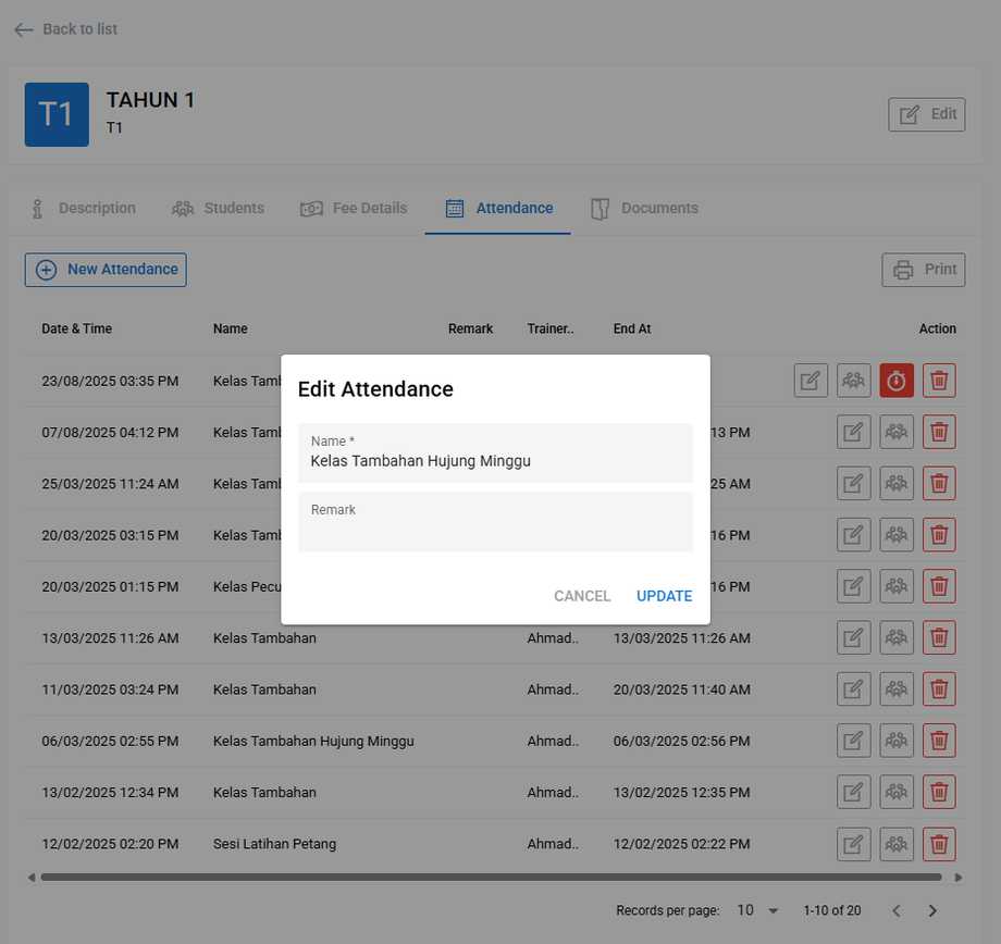 Step 2: Once clicking the Edit icon, Edit Attendance form will appear. User able to change the information and click Update button to save.