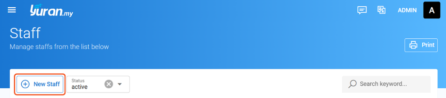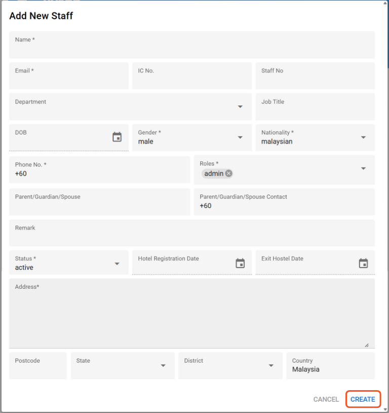 Step 3: Fill in the required information in the Add New Staff form. Then, click "Create" button to save the data.
