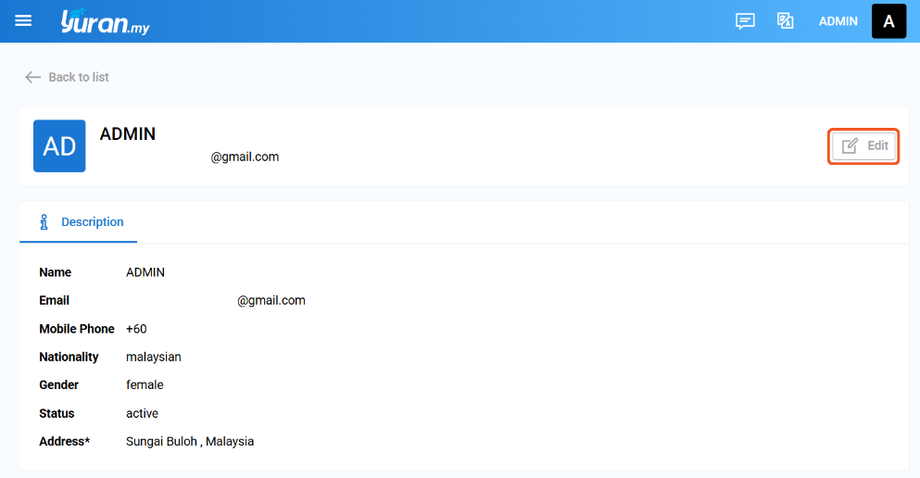 Step 2: User able to view the staff's details on Description at the View Staff page. User also able to edit staff's info by clicking the Edit button.