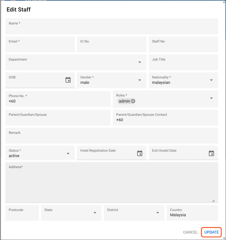 Step 2: Update the information needed in the Edit Staff form. Click "Update" to save the data.