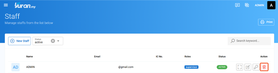 Step 1: Click the "Delete" icon at the Action section on Staff page.