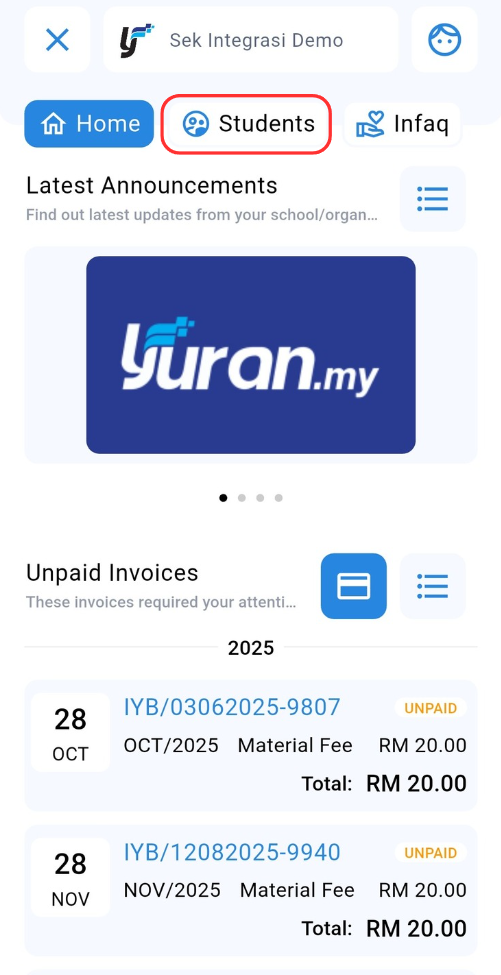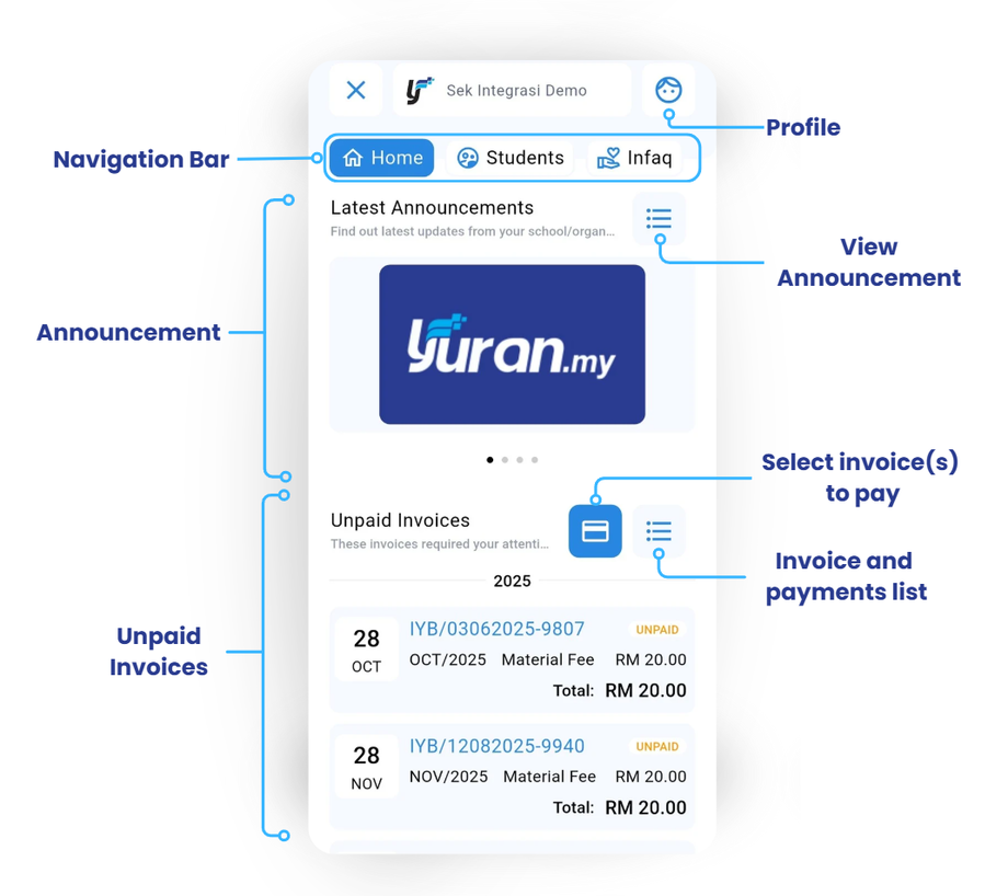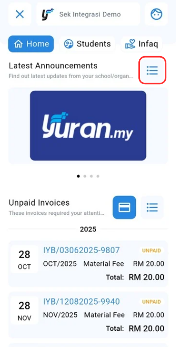 The Home page of the Yuran.my app provides a quick overview of the latest announcements and a summary of any unpaid invoices. It serves as the main dashboard for users to stay updated and manage their payments efficiently.
