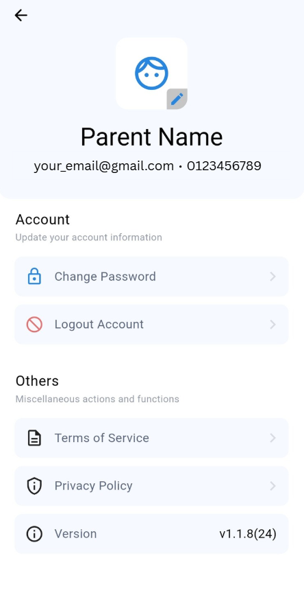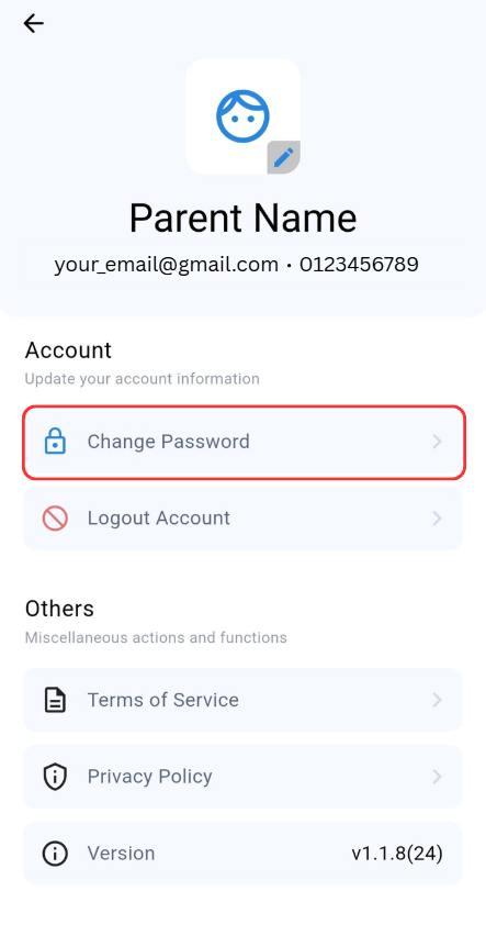 At Profile page, user able to Change Password and Logout Account under Account category. Besides, user able to view Terms of Service, Privacy Policy, and Version under Others category.