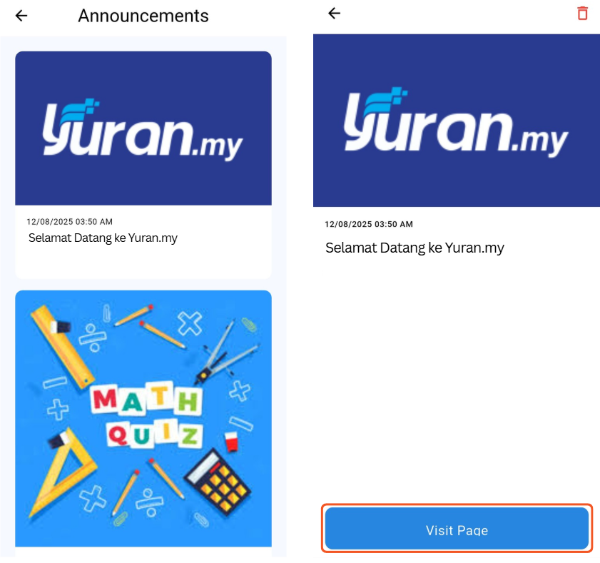 Step 2: Click on the Announcement, News or Event post to read the details. Click "Visit Page" to redirect to attached link.