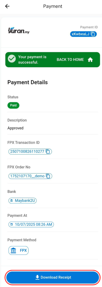 Step 3: After success payment, you can download the receipt as shown.