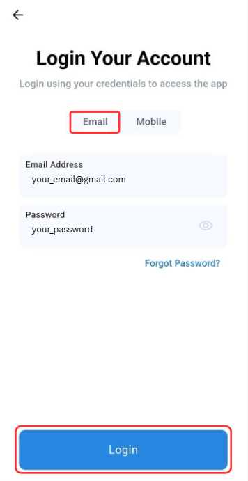 Step 1: Choose the Email credential option. Insert your registered Email Address and Password. Then, click "Login" button