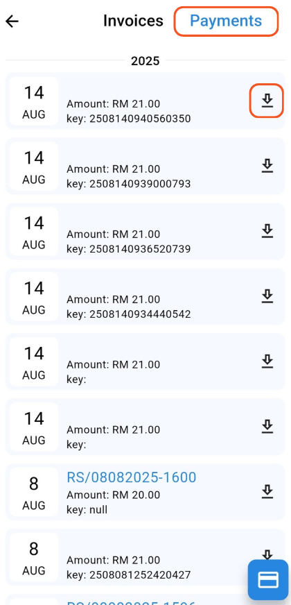 Step 2: Go to Payments tab. Then, click "Download" icon on the payment to download the receipt.