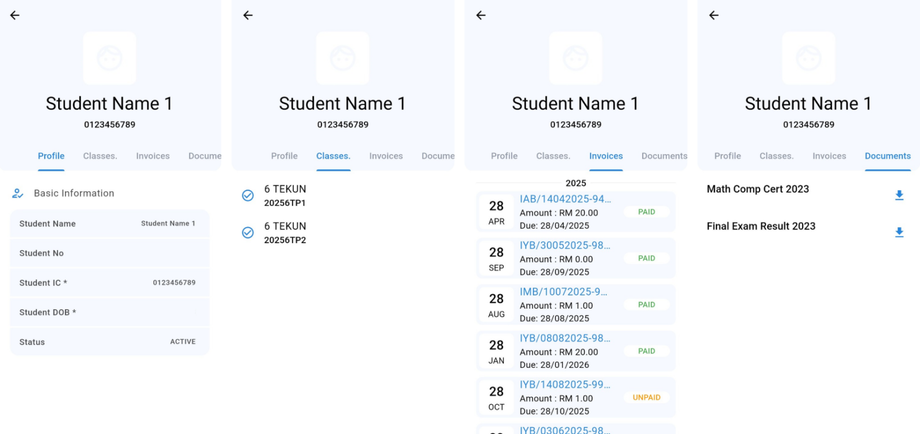 Step 3: At this page, user able to view about the Student/Player/Asset Profile, Classes/Events, Invoices and Documents.