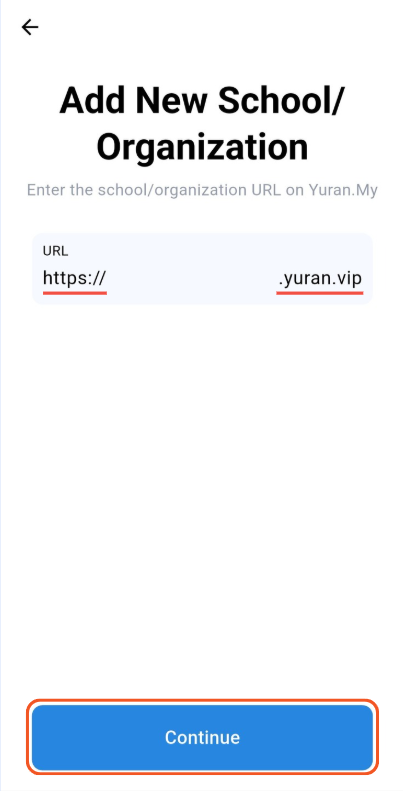 Step 2: Enter the school/organization URL on Yuran.My or the subdomain name. Then, click the "Continue" button.