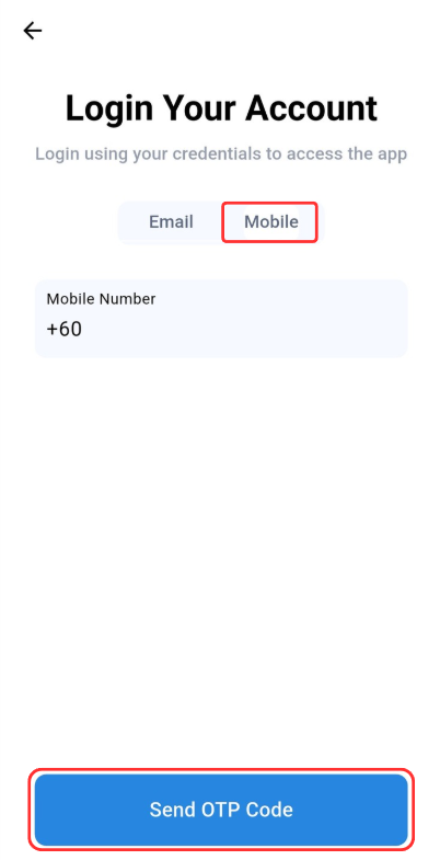 Step 1: Choose the Mobile credential option. Insert your Mobile Number and click "Send OTP Code" button.