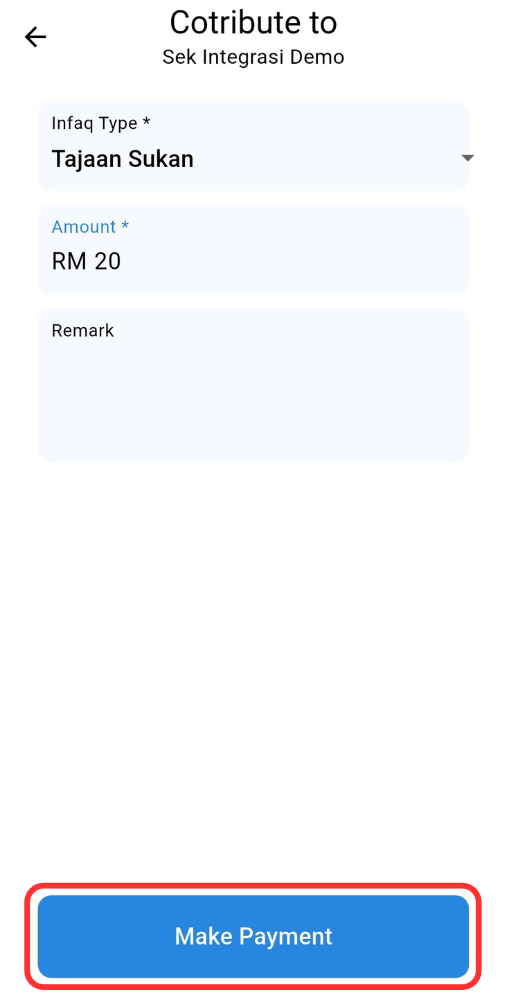 Step 2: Choose Infaq Type, enter the required fields and click "Make Payment" button.