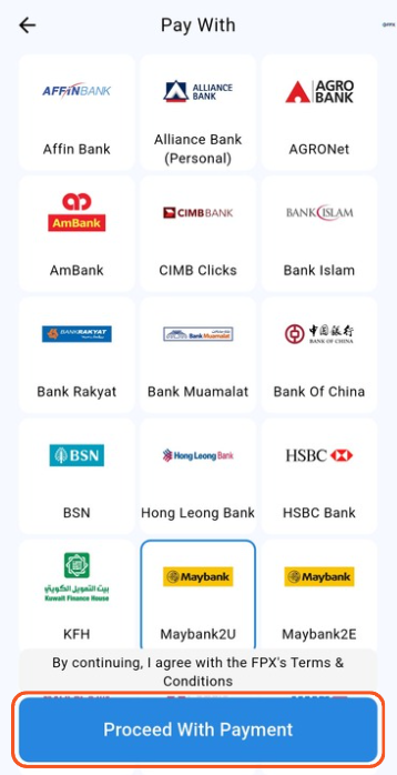 Step 2: Select bank and click "Proceed With Payment" button to be redirected to FPX payment gateway.