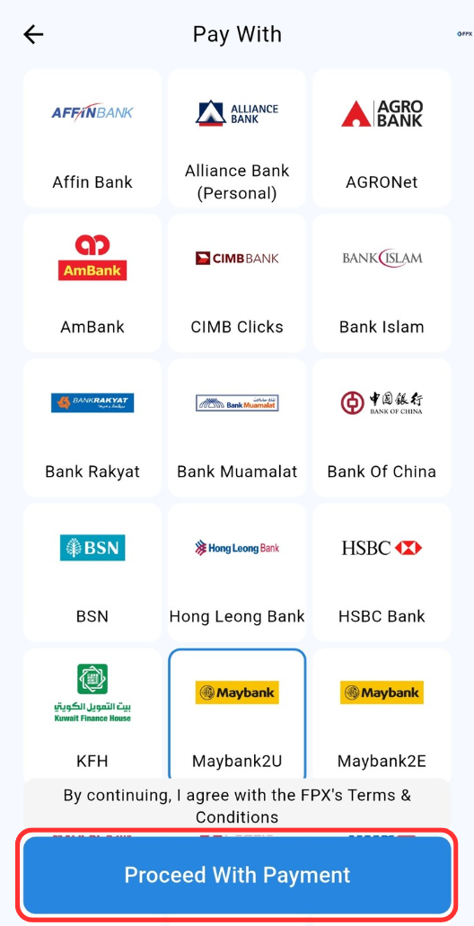 Step 3: Select bank and click "Proceed With Payment" button to be redirected to FPX payment gateway.