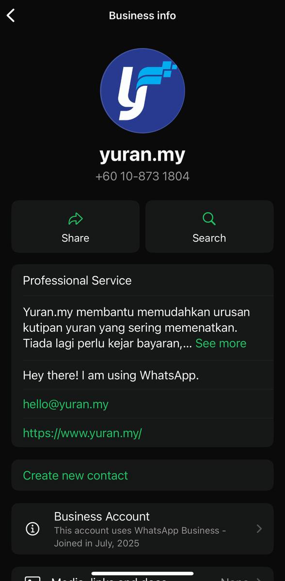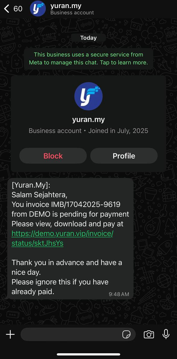 Yuran.my telah beralih menggunakan Official Whatsapp untuk menghantar notifikasi melalui Whatsapp. Oleh itu, semua pelanggan akan mendapat notifikasi melalui Whatsapp daripada nombor Official Yuran.my.