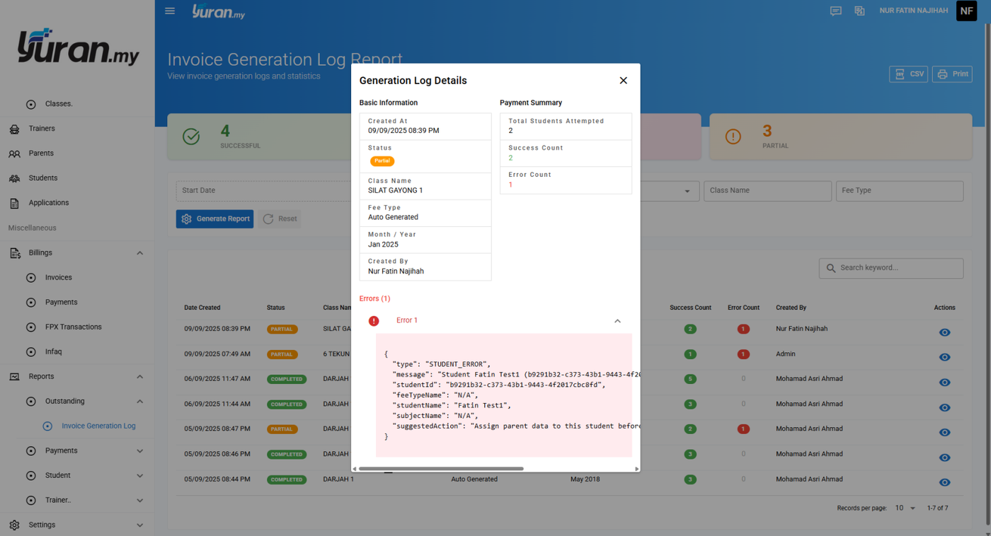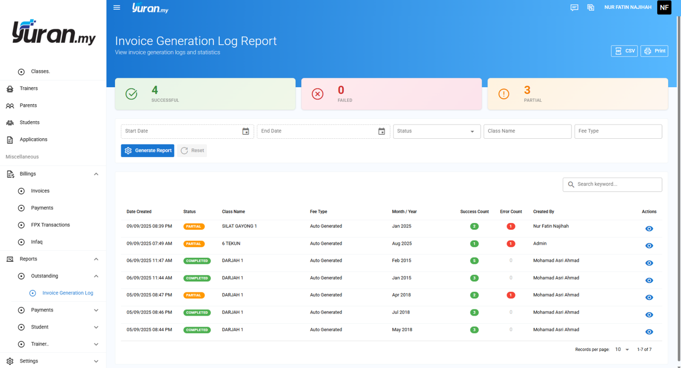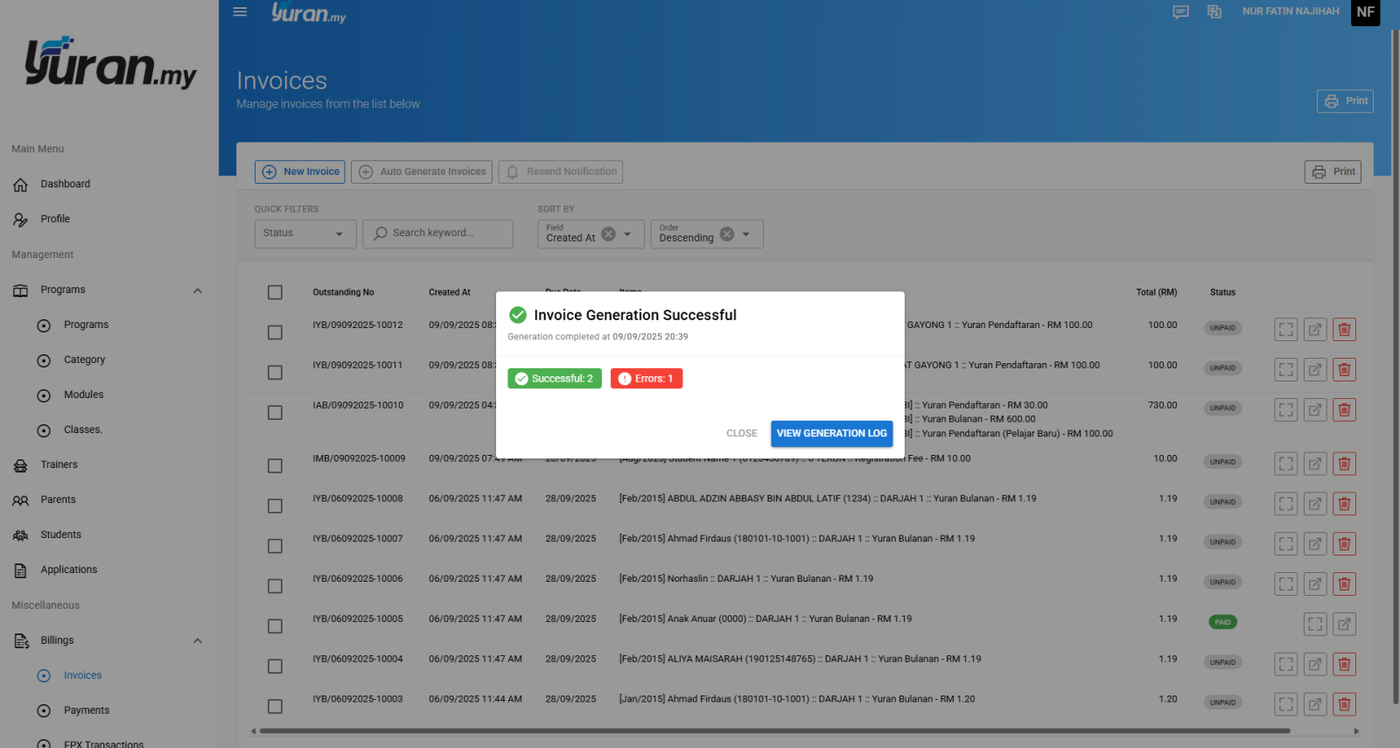 Penambahan report pada menu Reports>Outstanding>Invoice Generation Log untuk melihat lebih lanjut detail berkenaan dengan invois yang telah dijana seperti,