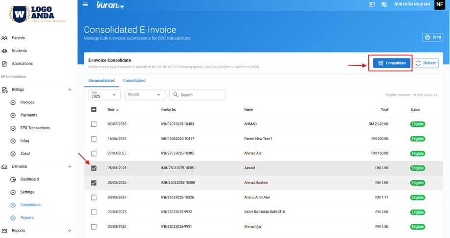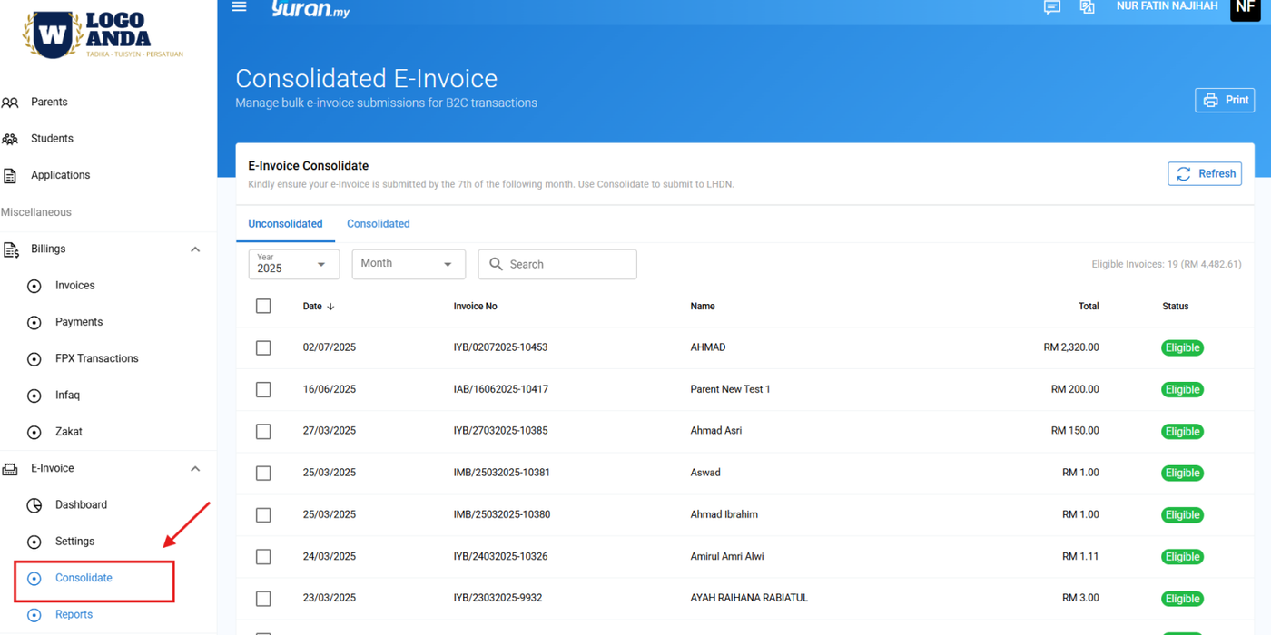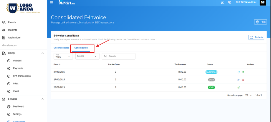 Step 1: Klik pada Consolidate di bahagian menu E-Invoice.