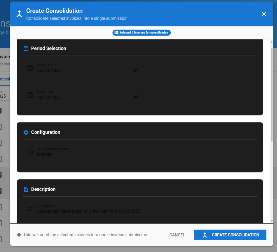 Step 5: Klik pada butang CREATE CONSOLIDATION sekiranya semua maklumat invois adalah benar. Mesej seperti yang dinyatakan di bawah akan keluar sekiranya anda berjaya.