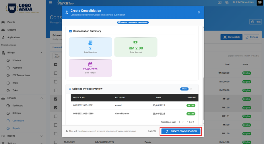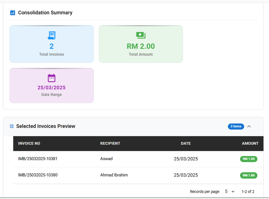 Step 4: Anda boleh melihat Consolidation Summary dan Selected Invoices Preview.