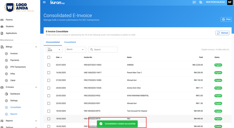 Step 6: Anda boleh melihat senarai invois yang telah digabungkan pada menu Consolidated.