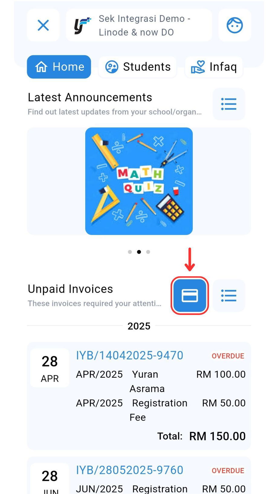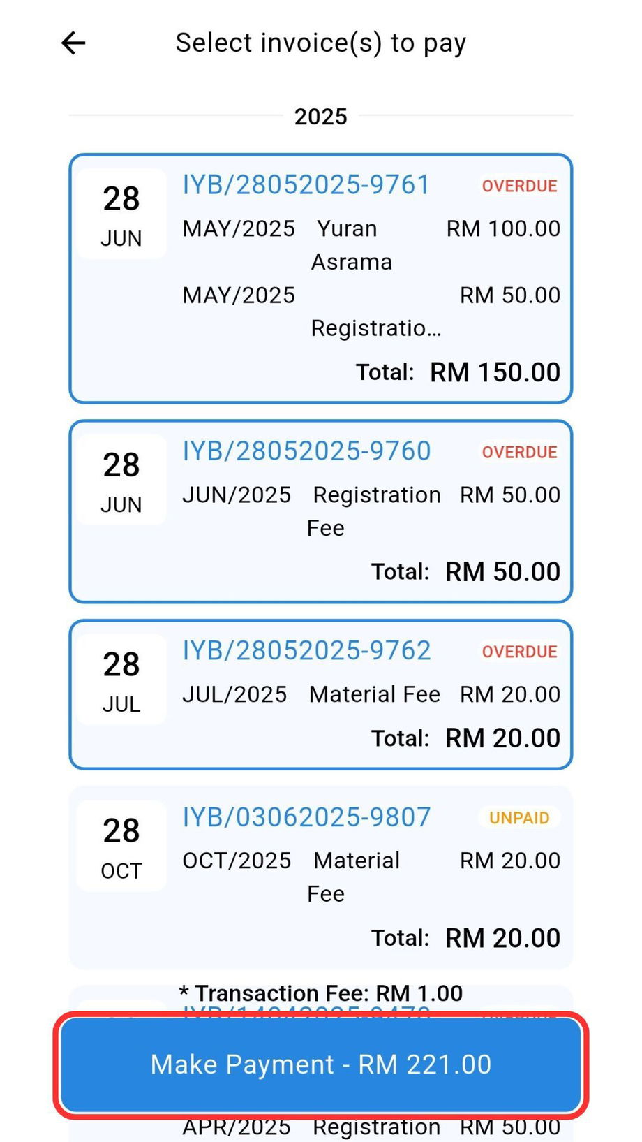 Kita boleh buat bayaran untuk satu invois atau lebih. Bayaran lebih daripada satu invois hanya boleh dibuat melalui aplikasi yuran.my.