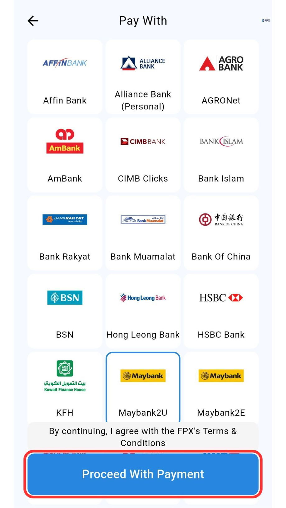 > Pilih bank anda dan tekan butang "Proceed with Payment" untuk teruskan proses pembayaran