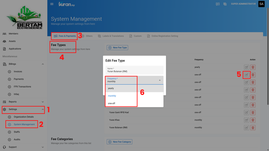 Kenapa yuran bulanan fee frequency adalah one-off bukan monthly? Itu adalah default value semasa awal migration hari tu. Boleh ubah frequency dekat setting > system management > fees & payment > fee types > klik icon edit untuk edit. Kemudian klik update.