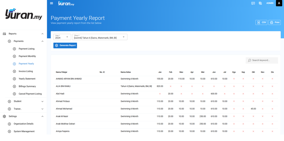> Jika tidak bayar atau belum bayar, akan ada simbol pangkah (❌) untuk menyatakan yang yuran bulan tersebut belum diselesaikan.
