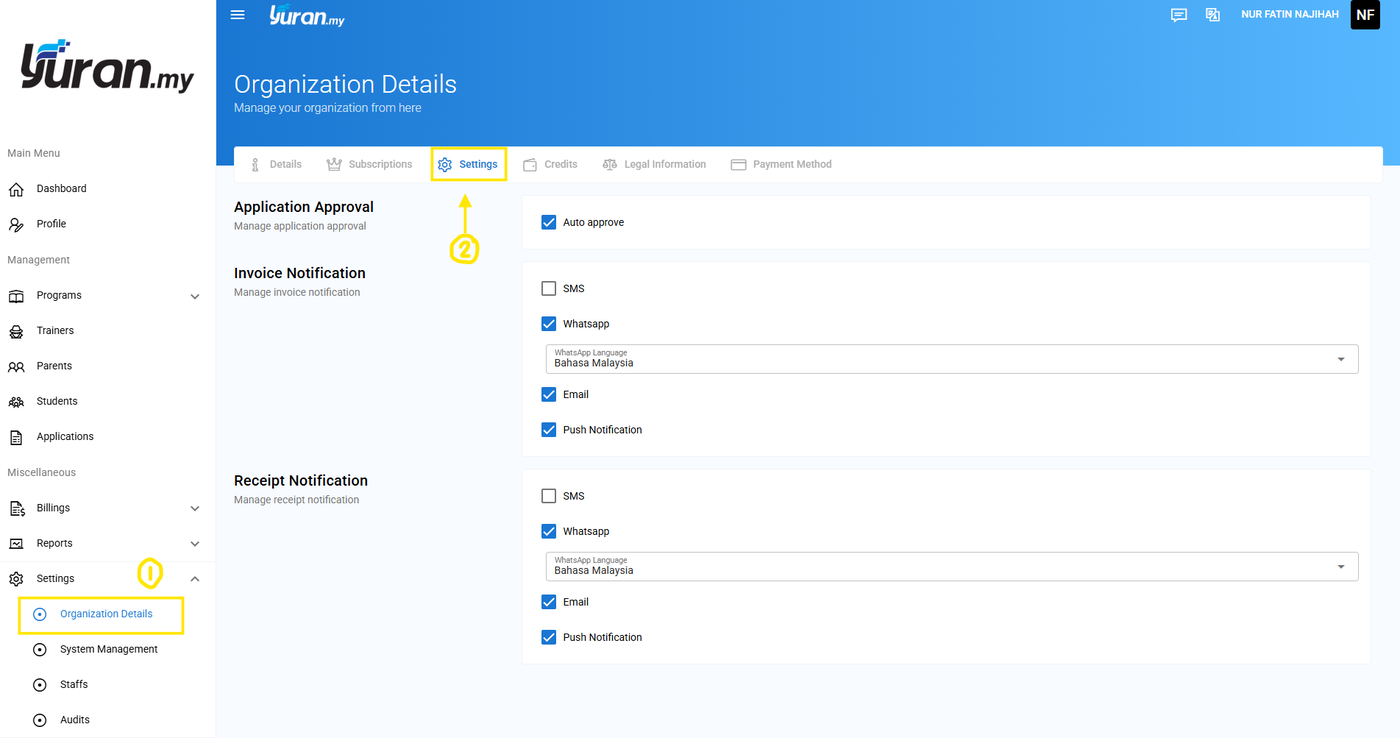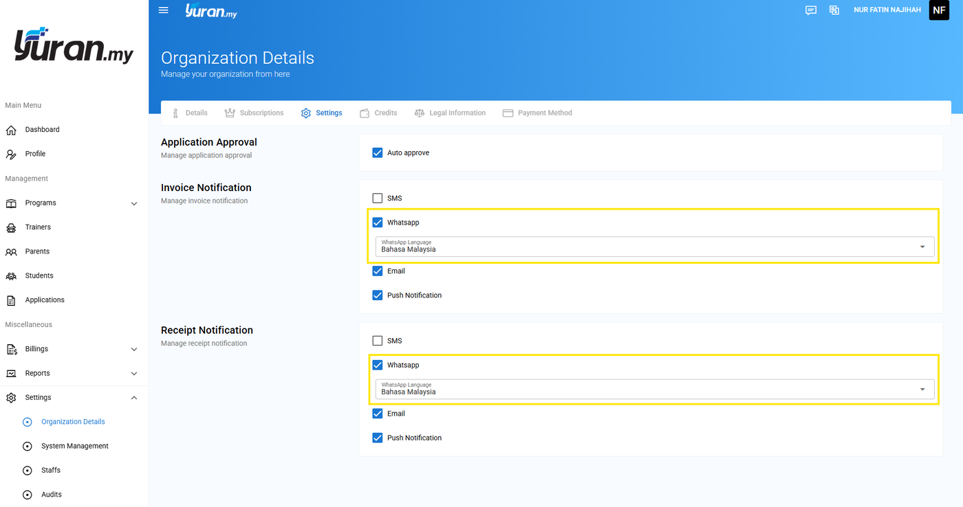 Langkah 2: Pilih Whatsapp Language Bahasa Malaysia/Bahasa Inggeris untuk Invoice Notification atau Receipt Notification