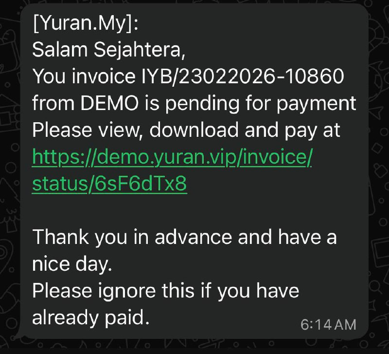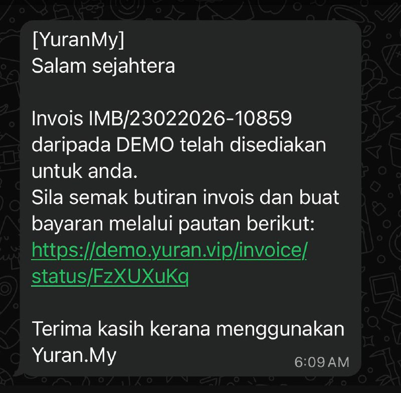 Invoice Notification dan Receipt Notification melalui Whatsapp boleh dihantar dalam 2 jenis bahasa iaitu