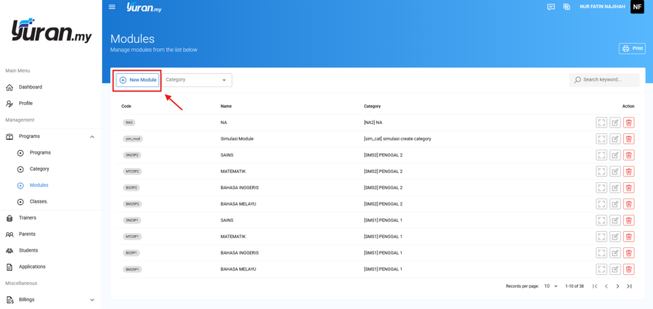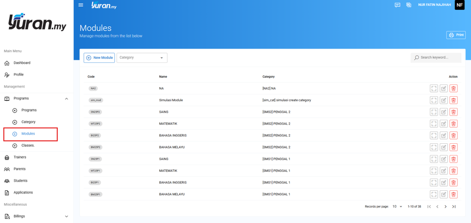Step 2: Once user click the View icon, user able to view the category’s details on View Category page. User also able to create a New Activities or New Modules by clicking the Activities/Modules navigation.