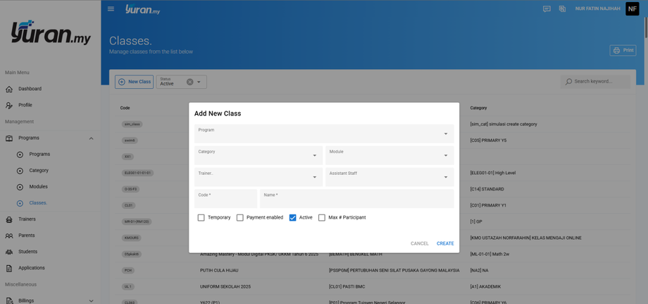 Step 3: Once user click the New Class/New Event button, Add New Class form or Add New Event form will appear. Fill in all the information needed and click Create button to save the data.