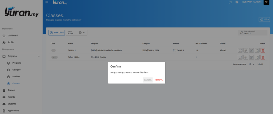 Step 1: Click the Delete icon at the Action section on Classes or Events page.