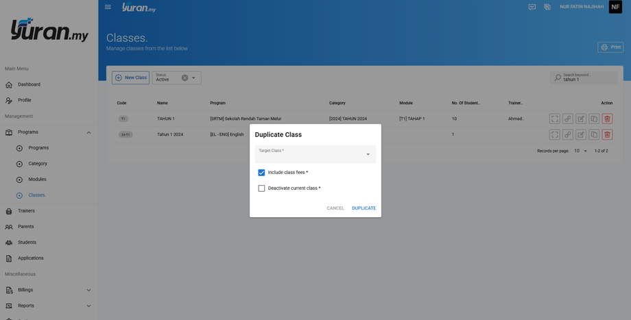 Step 2: Once click the Duplicate icon, Duplicate Class form or Duplicate Event form will appear.