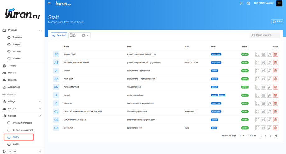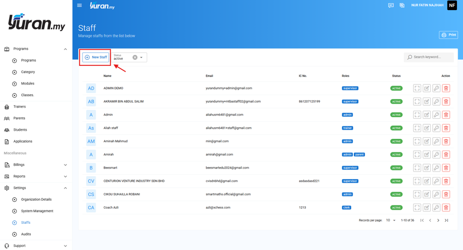 Step 1: Click Staffs menu under Settings category at the left panel.