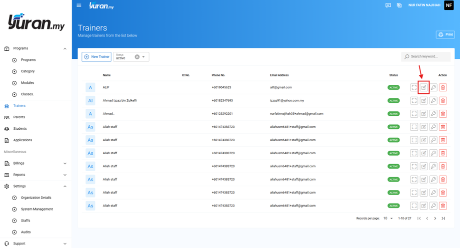 Step 1: Click the Edit icon at the Action section on Trainer's page.