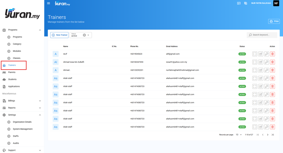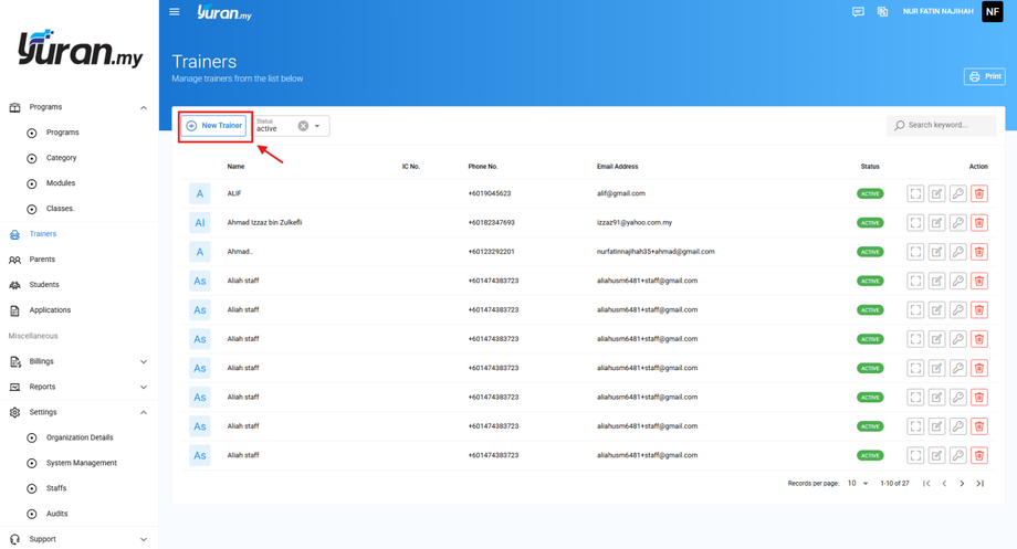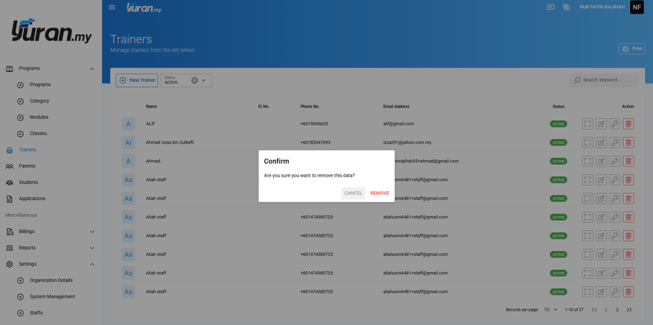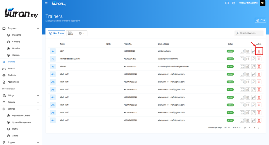 Step 1: Click the Delete icon at the Action section on Trainers page.