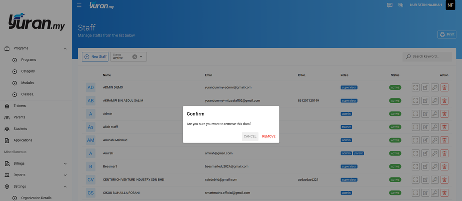 Step 1: Click the Delete icon at the Action section on Staff page.